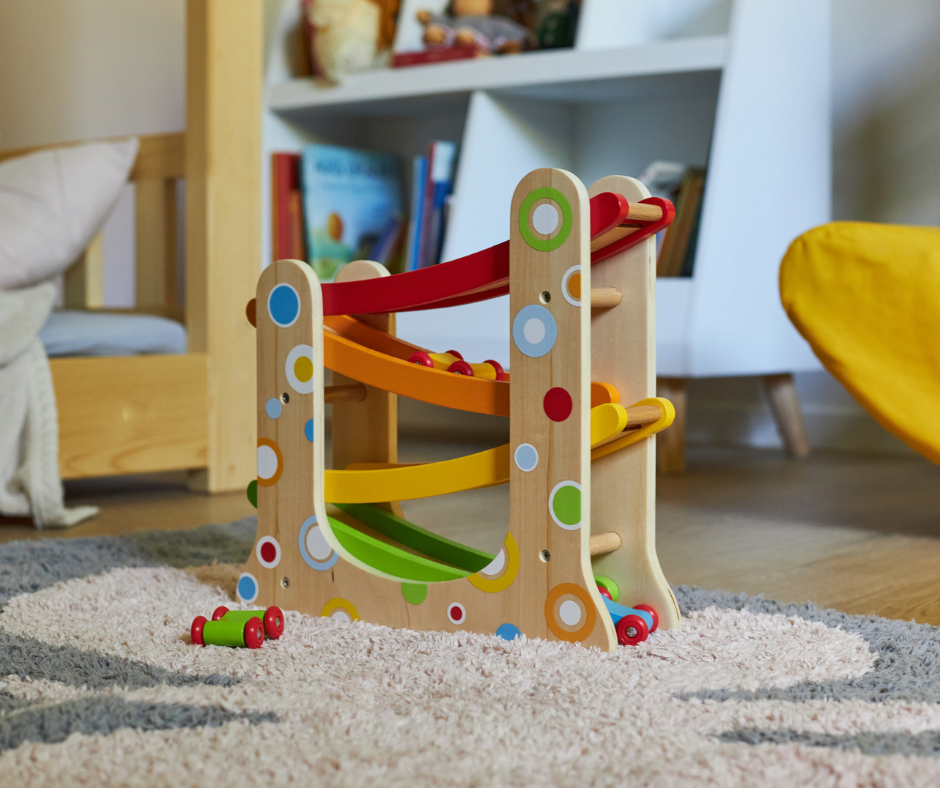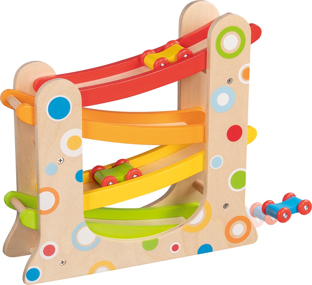 This wooden car racetrack inspires with its almost tangible dynamics. This cheerful colourful design, which is an invitation to play, supports the beautifully styled body impressively. But the toy only really comes into its own when the 3 wooden vehicles whizz along the tracks. Put the cars on the upper track, look, listen, catch a vehicle at the lower exit and put it back on top. That doesn't just sound like fun and action - it's the ultimate in active play fun.