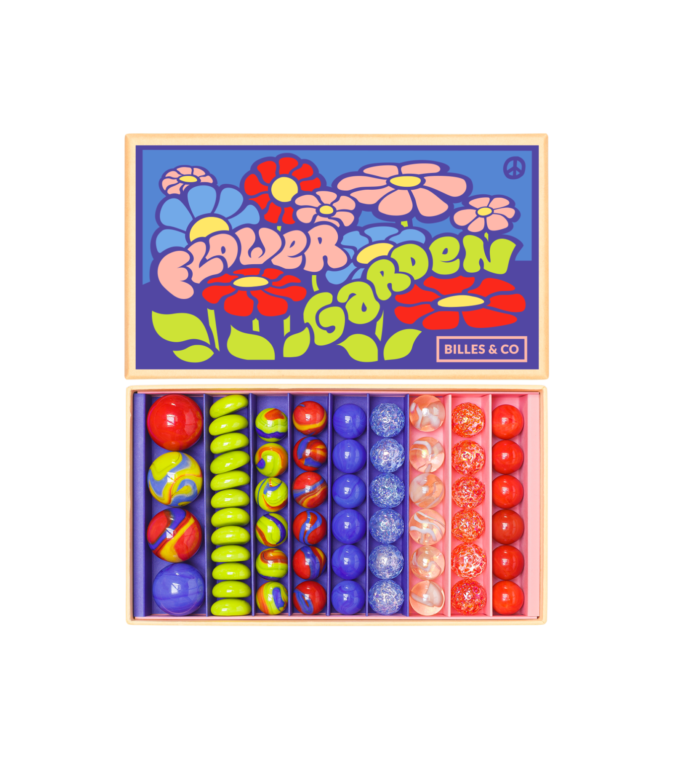 Assortment of marbles with exhilarating colors, for a walk in a garden full of multicolored flowers. Let yourself be conquered by the flower power and give yourself a bouquet that will never fade.